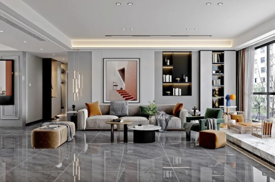 沒(méi)有復(fù)雜的紋理穿插,淡淡的白色線條點(diǎn)綴,明暗交替間紋理變化,既豐富了整體空間的肌理層次,亦能烘托出空間的高級(jí)氛圍。