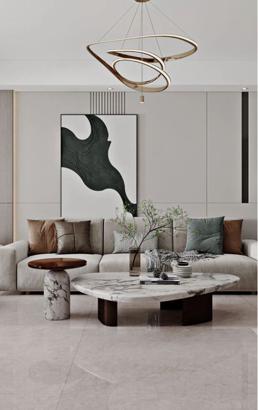 地面的主角哈爾施灰,飄逸的紋理,如無拘無束的靈魂,隨性優(yōu)雅。深淺不一的自然過渡,配合頗具檔次的不規(guī)則燈具、絨布沙發(fā)以及大膽有趣的抽象畫,讓空間充滿時尚,不落俗套。