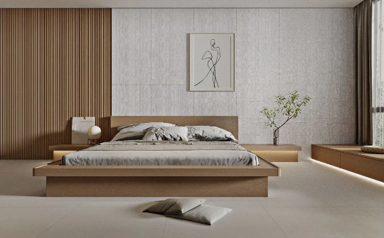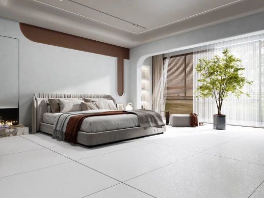 陽光透入,地面采用750x1500mm沁園春通鋪,啞、柔、亮的三維浮雕質感效果,10°微光配合大面積木質元素的運用,讓家居的自然氣息悄然流露,營造出舒適、溫馨的睡眠環境。