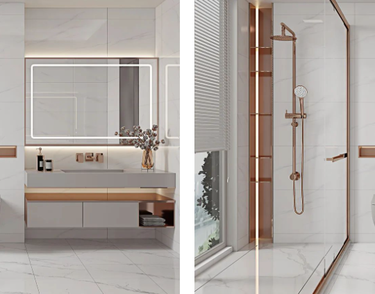哥倫比亞白通體自帶的爽朗現(xiàn)代感,結(jié)合大理石紋進(jìn)行通鋪,讓衛(wèi)浴間格外明亮之余,無(wú)限連紋拉伸空間視覺(jué)比例,給人一種賞心悅目的天然感受。