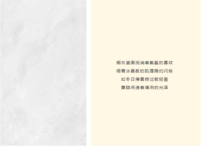 突破傳統瓷磚的二維表達,以三層納米釉料疊加工藝,構筑立體光感矩陣,經1280度高溫淬煉,凝結98度水晶光感,讓釉面在歲月侵蝕中始終葆有初生般的透潤光澤。