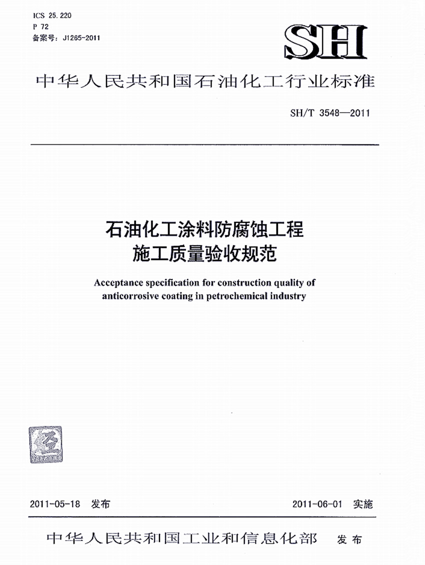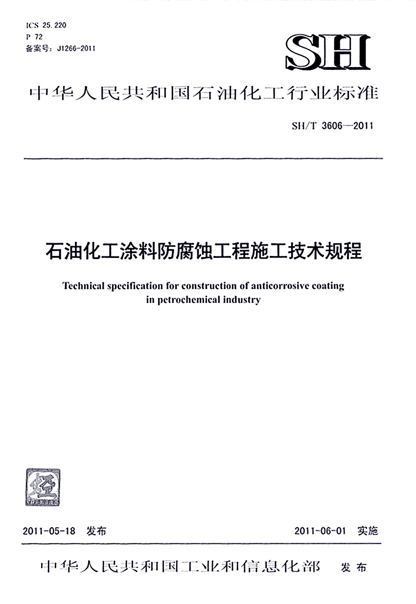 石油化工涂料防腐蝕工程施工技術規程標準SH/T 3606-2011 ICS25.220 P72 備案號:J1266-2011 SH 中華人民共和國石油化工行業標準 SH/T 3606-2011石油化工涂料防腐蝕工程施工技術規程 Technical spccificatinon for construction of anticorrosive coating in pctrochcmical in